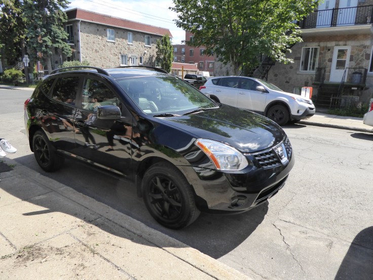 Une jolie Nissan Rogue, noire, vitres teintées, jantes noires… bon elle a 130 000 kms !!! mais elle est très sympa… Ah si j’oubliais elle est 4 roues motrices… 🙂 … pour nous, ça parait une évidence, pour les québécois ça les fait beaucoup rire !